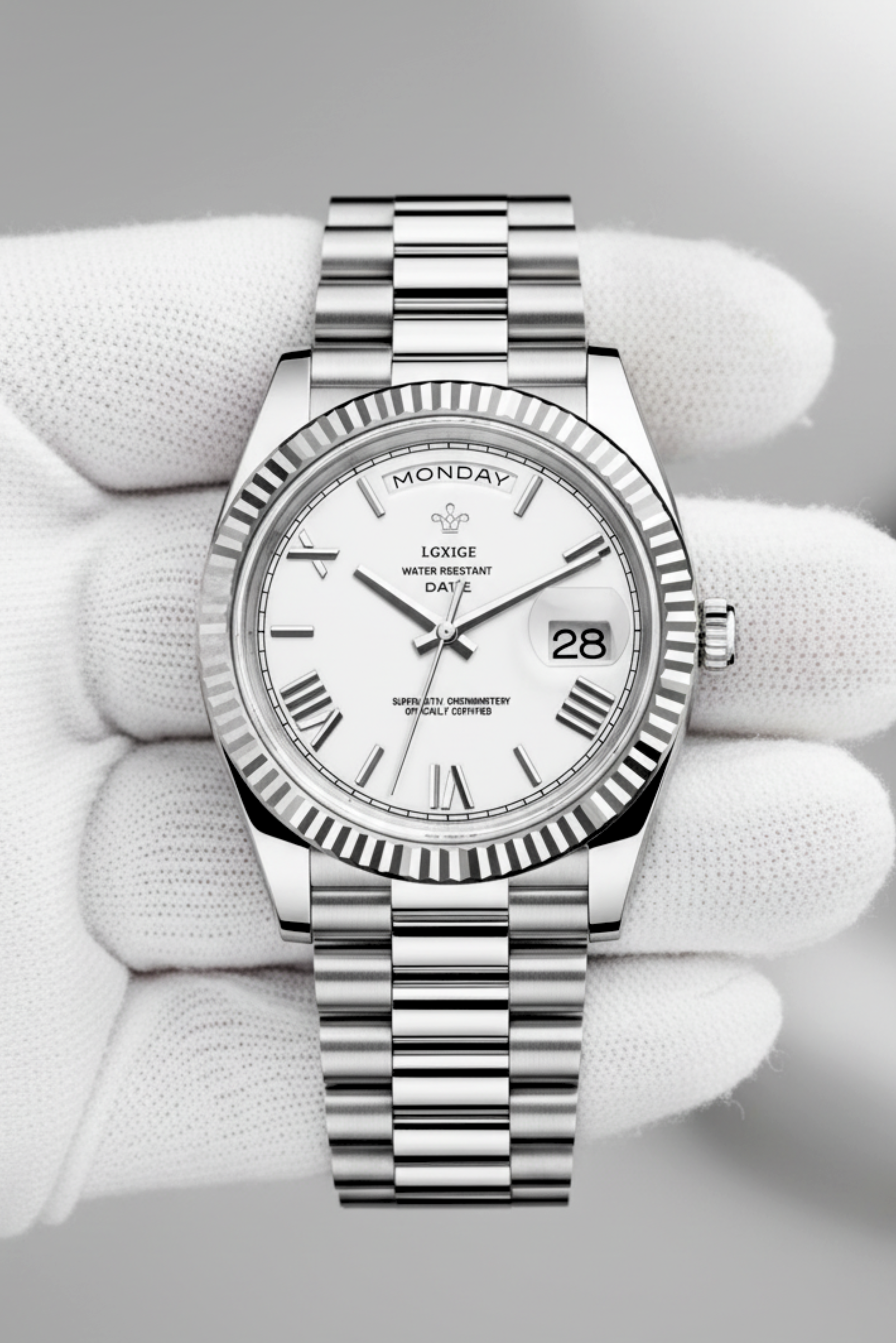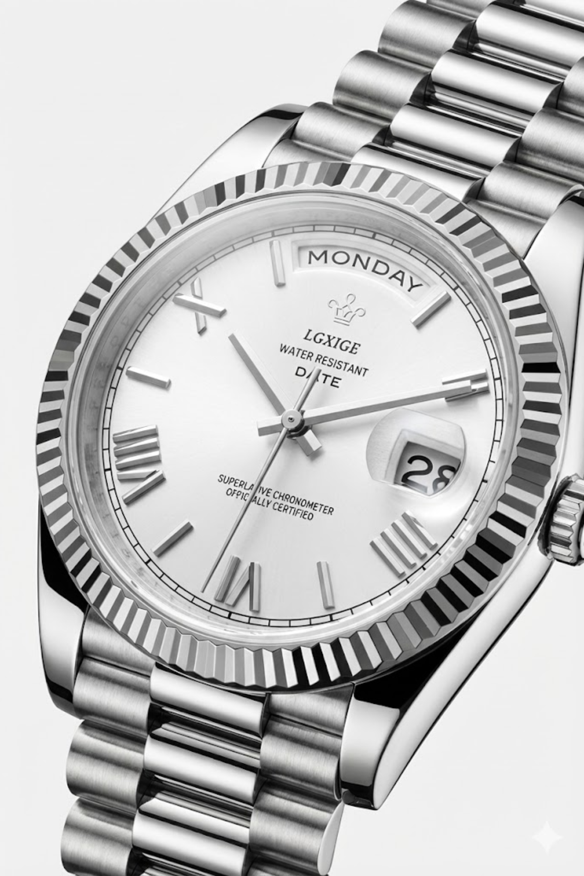 Defined by distinction. The Hofmann Jubilee is a masterclass in classic horology, featuring a brilliant fluted bezel that plays with the light. The dial is anchored by a full-text day display at the top and a date window at three o'clock, offering clarity and class. Paired with an intricate metal bracelet, it is the ultimate statement of success.